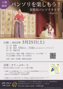 パンソリとは、唱者(歌い手)と鼓手(太鼓を打つ人)の二人で奏でられる、楽譜がない口承伝統芸能です。パンソリの「パン(판)」は多くの人々が集まる場所を、「ソリ(소리)」は音を意味しています。2003年にユネスコの無形文化遺産に登録されました。 パンソリの世界を満喫するためのポイントは「声を楽しむ」「表情を楽しみ、場面を想像する」「チュイムセ(掛け声)を入れる」等…。唱者と観客との一体感が生まれるのも魅力のひとつです。 「今回のライブは「水宮歌」と「興甫歌」Part.2の続編をお楽しみいただきます!また、みんなで楽しめるプログラムもありますよ。世代を問わずパンソリの魅力を感じていただける内容になっています。ぜひお越しください。」
