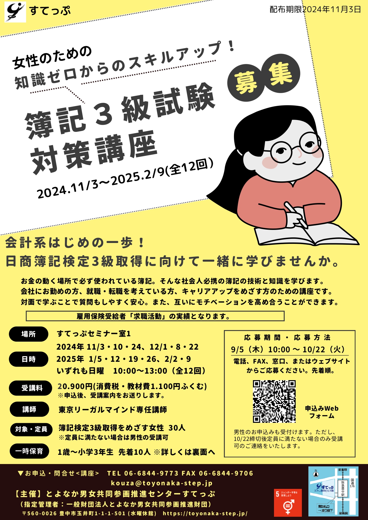 簿記検定3級をめざす女性 30人   ※男性のお申込みも受付けます。ただし、10/22締切後定員に満たない場合のみ受講可のご連絡をいたします。