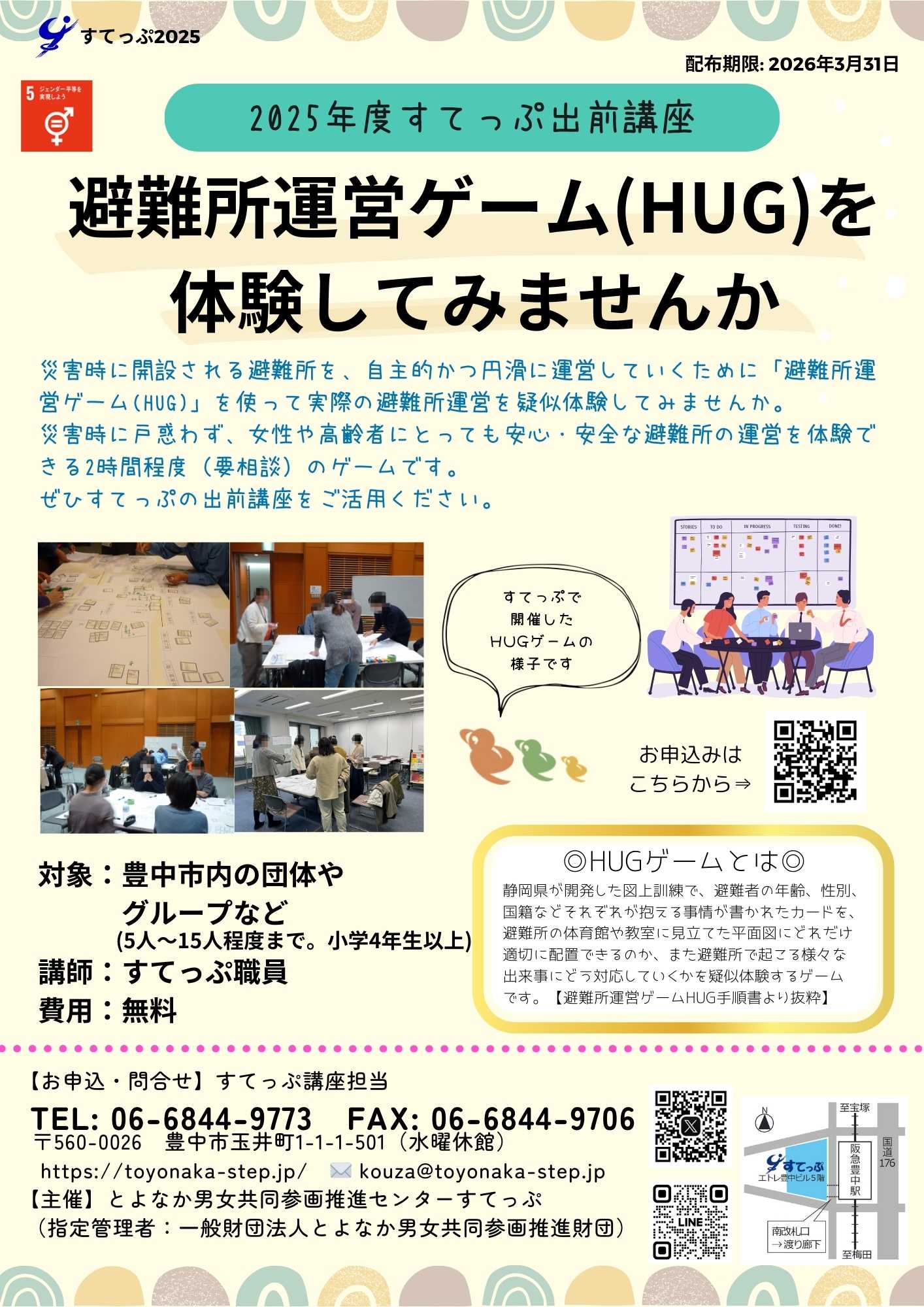 災害時に開設される避難所を、自主的かつ円滑に運営していくために「避難所運営ゲーム(HUG)」を使って、実際の避難所運営を疑似体験してみませんか。すてっぷ出前講座をご活用ください。