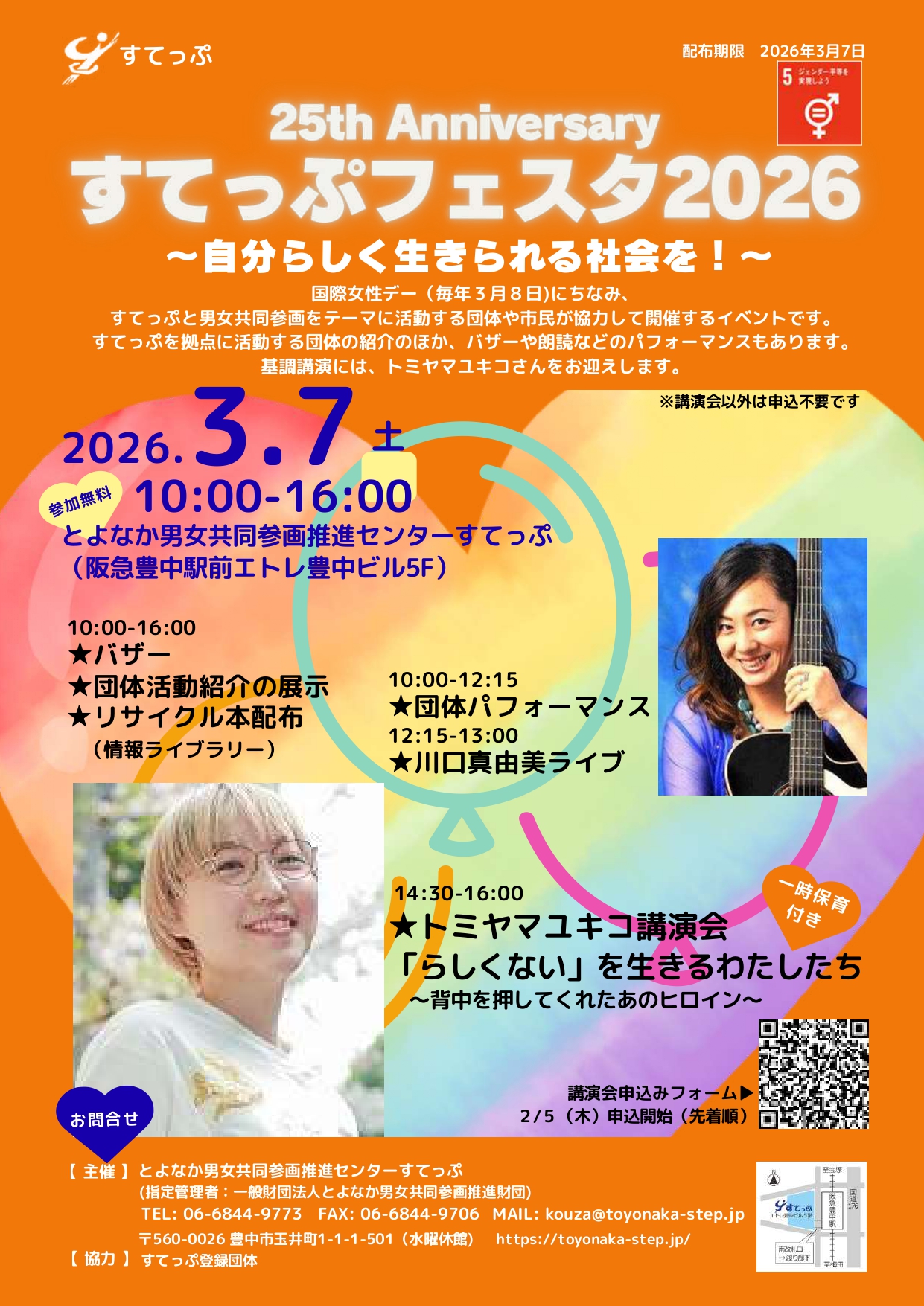 | 主催 | 【主催】とよなか男女共同参画推進センターすてっぷ (指定管理者 一般財団法人とよなか男女共同参画推進財団) 【申込み・問合せ】すてっぷ講座担当 電話: 06-6844-9773 FAX: 06-6844-9706 メール: kouza@toyonaka-step.jp |