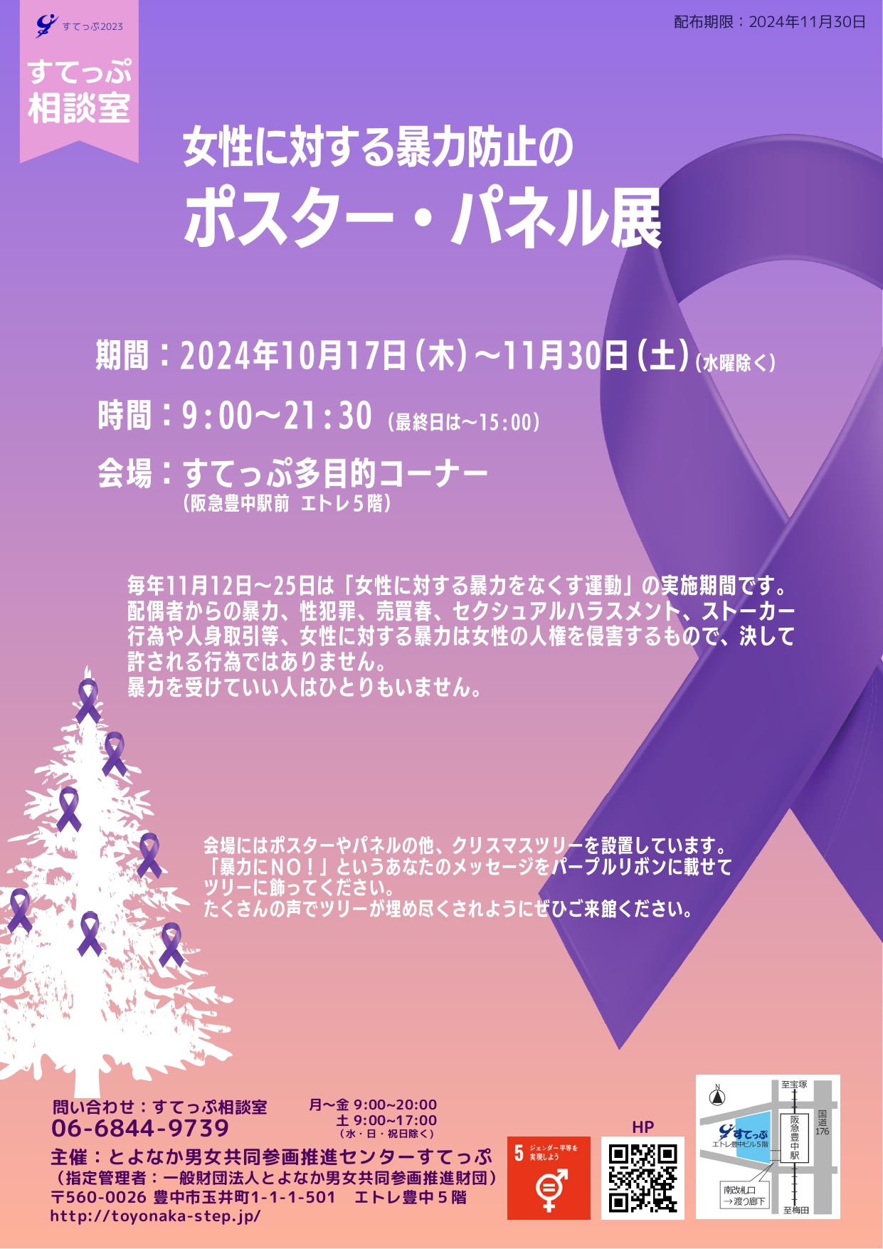 - 会場にはポスターやパネルの他、クリスマスツリーを設置しています。「暴力にNO!」というあなたのメッセージをパープルリボンに載せてツリーに飾ってください。
